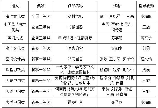 今年3月,我校人文傳播系(原語言文學(xué)系)組織師生積極備賽,經(jīng)過4個(gè)月的作品設(shè)計(jì)與打磨,通過校賽選拔了128件作品晉級參賽。其中,龐海艦副教授指導(dǎo),彭一等同學(xué)的作品《塑料危機(jī)》榮獲海洋文化類全國一等獎(jiǎng);由王旋副教授指導(dǎo),肖雪等同學(xué)的作品《花候圖鑒》榮獲中國風(fēng)傳統(tǒng)文化類全國三等獎(jiǎng);由黃杏子副教授指導(dǎo),陳宇晨同學(xué)的作品《申城非遺·紅韻游蹤》榮獲老字號(hào)·新國潮創(chuàng)新設(shè)計(jì)賽道全國三等獎(jiǎng)。