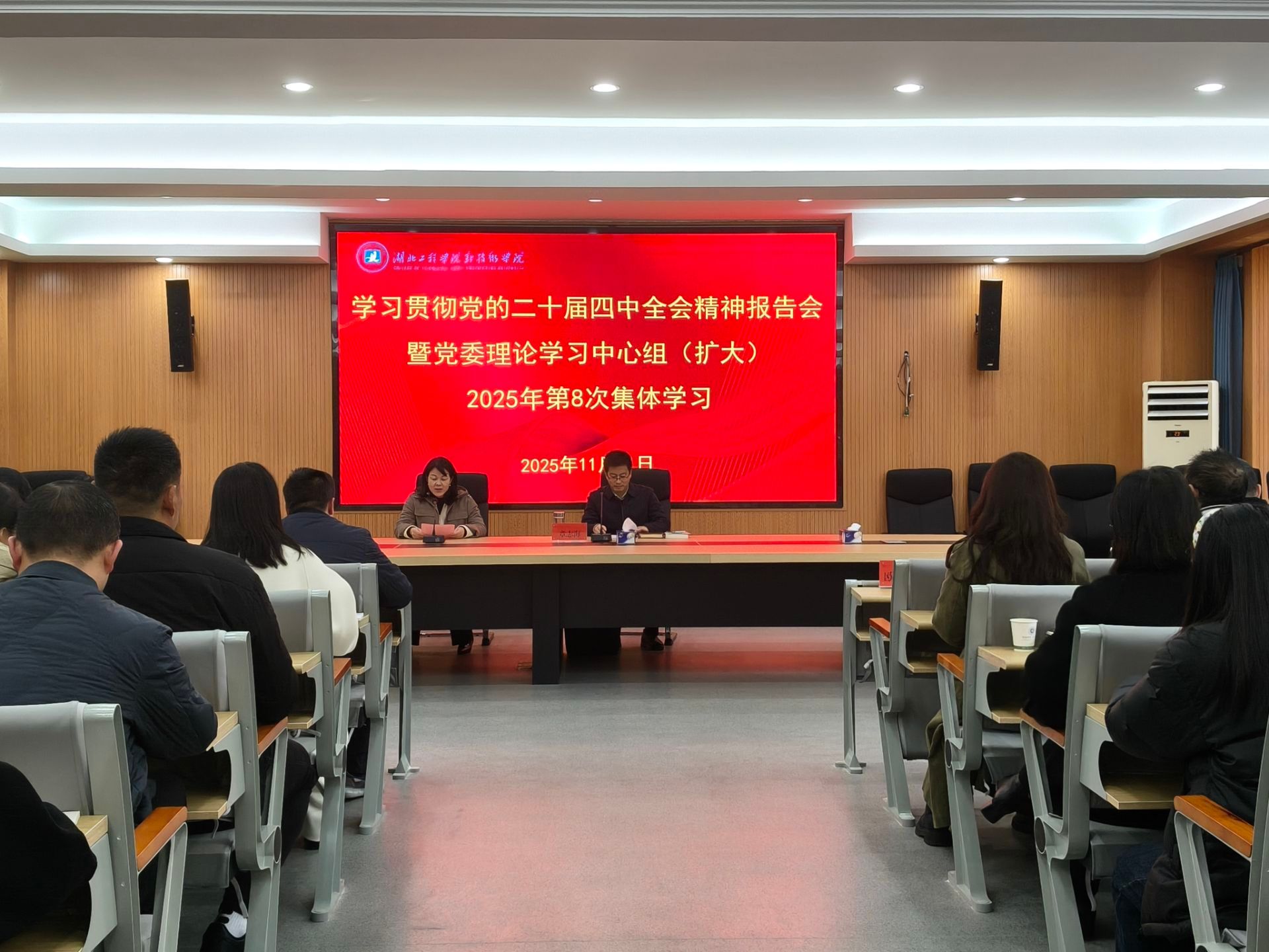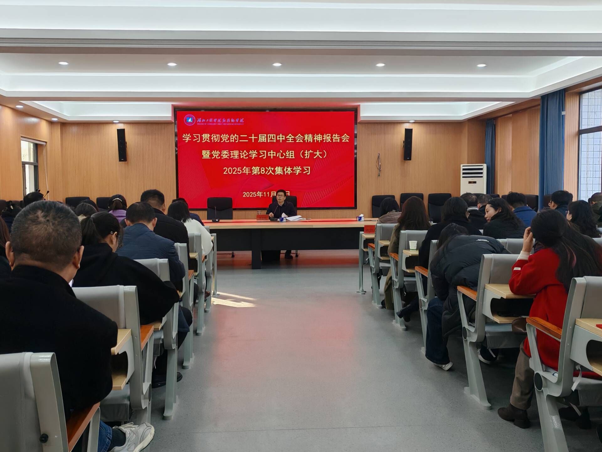本網(wǎng)訊 11月21日,學(xué)校學(xué)習(xí)貫徹黨的二十屆四中全會(huì)精神專題輔導(dǎo)報(bào)告會(huì)暨黨委理論學(xué)習(xí)中心組(擴(kuò)大)2025年第8次集體學(xué)習(xí)在科技樓212多功能會(huì)議廳舉行。校領(lǐng)導(dǎo)張輝、歐陽(yáng)莎莉、陳友華、蔣成、郭勇出席,全體中層干部及教師黨員代表70余人參加。黨委書記歐陽(yáng)莎莉主持學(xué)習(xí)會(huì)。